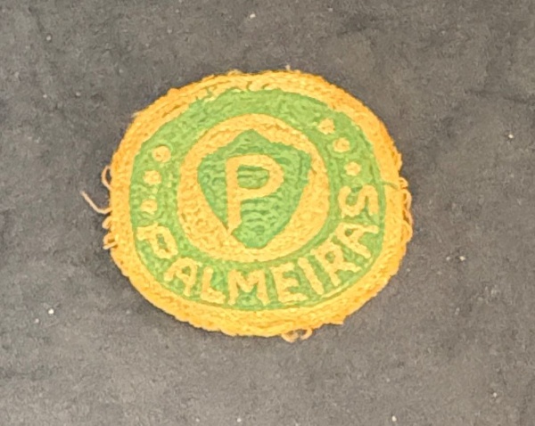 Antigo distintivo em tecido bordado da Sociedade Esportiva Palmeiras, medindo aproximadamente 9 cm de diâmetro