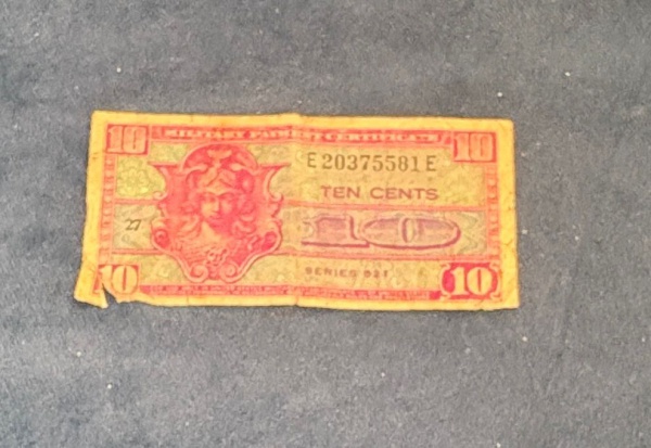 U.S. Army 10 Cents Military Payment Certificate Series 521. Foi emitida entre 1954 e 1958 e utilizada em diversos países, incluindo Áustria, Bélgica, ...